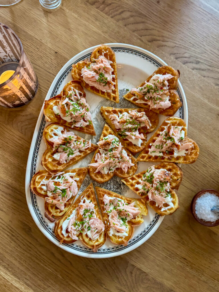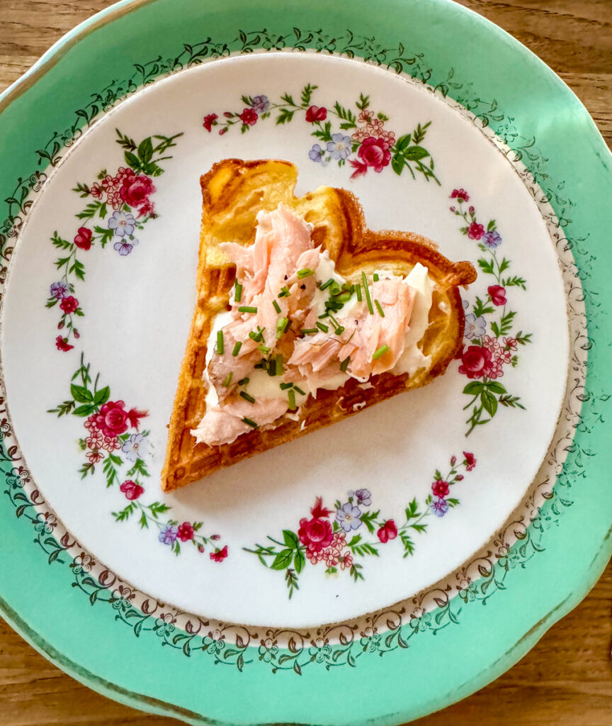 Jeg lager salte vafler ofte og hver gang gjør jeg en vri. Men denne varianten som jeg lagde tidligere denne uken er nok en av de aller mest vellykkede. Især med toppingen jeg valgte som var Rørosrømme og flaket varmrøkt laks fra Garnvik.