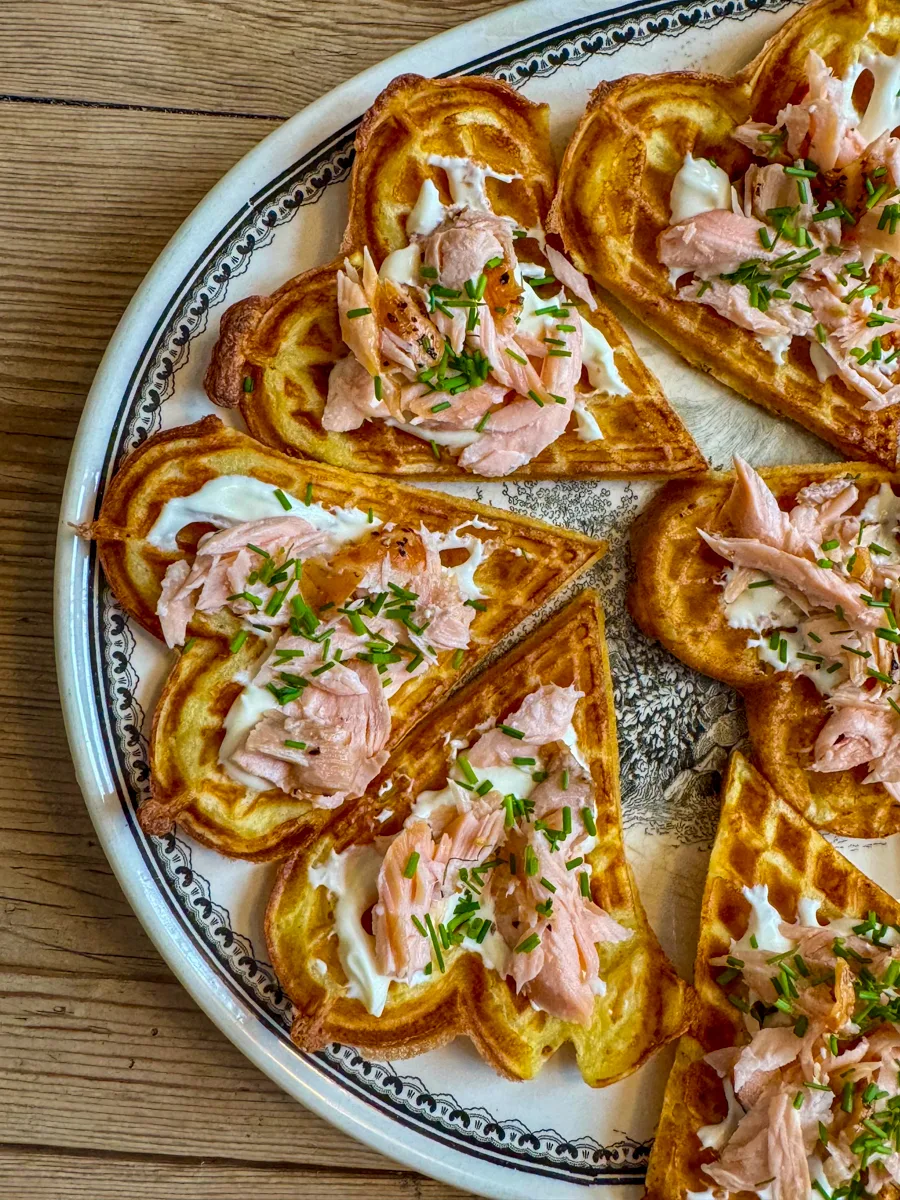 Jeg lager salte vafler ofte og hver gang gjør jeg en vri. Men denne varianten som jeg lagde tidligere denne uken er nok en av de aller mest vellykkede. Især med toppingen jeg valgte som var Rørosrømme og flaket varmrøkt laks fra Garnvik.