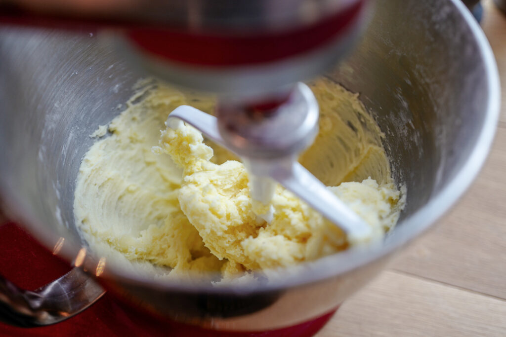 - Pisk sammen smør og melis. Tilsett et og et egg samt klementinskall