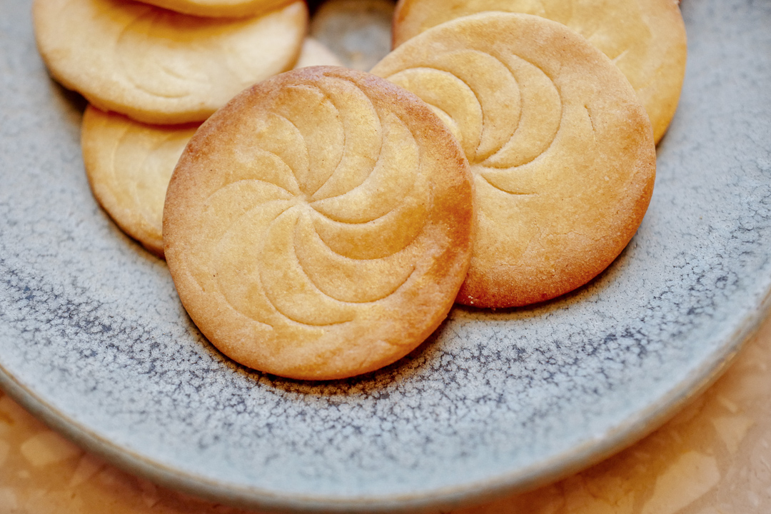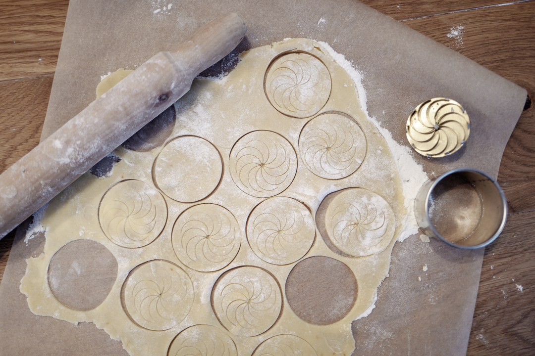 - Form deigen til en tykk pølse og legg den i plast. Legg kjølig i en time før du tar den ut og skjærer 1/6 del av pølsen. Kjevl ut på melet underlag med bakepapir under til du har en deig som er et par millimeter tykk. Stikk ut sirkler eller bruk andre fomer. Jeg brukte sirkler og pyntet toppen med et jern jeg kjøpte i Marokko for flere år siden. Dette finner du helt ut av selv. Du trenger ikke gi kjeksen mønster heller.