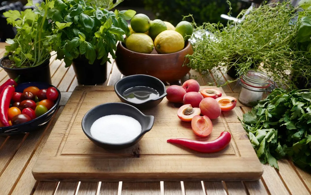 - Aprikosketchup: Kok halve aprikoser med eddik, sukker og chili til aprikosene brytes ned. Bruk en stavmikser til å mose ketchupen jevn.