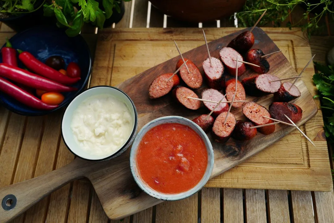 Pølsesnabber med aprikosketchup og bakt hvitløksmajones