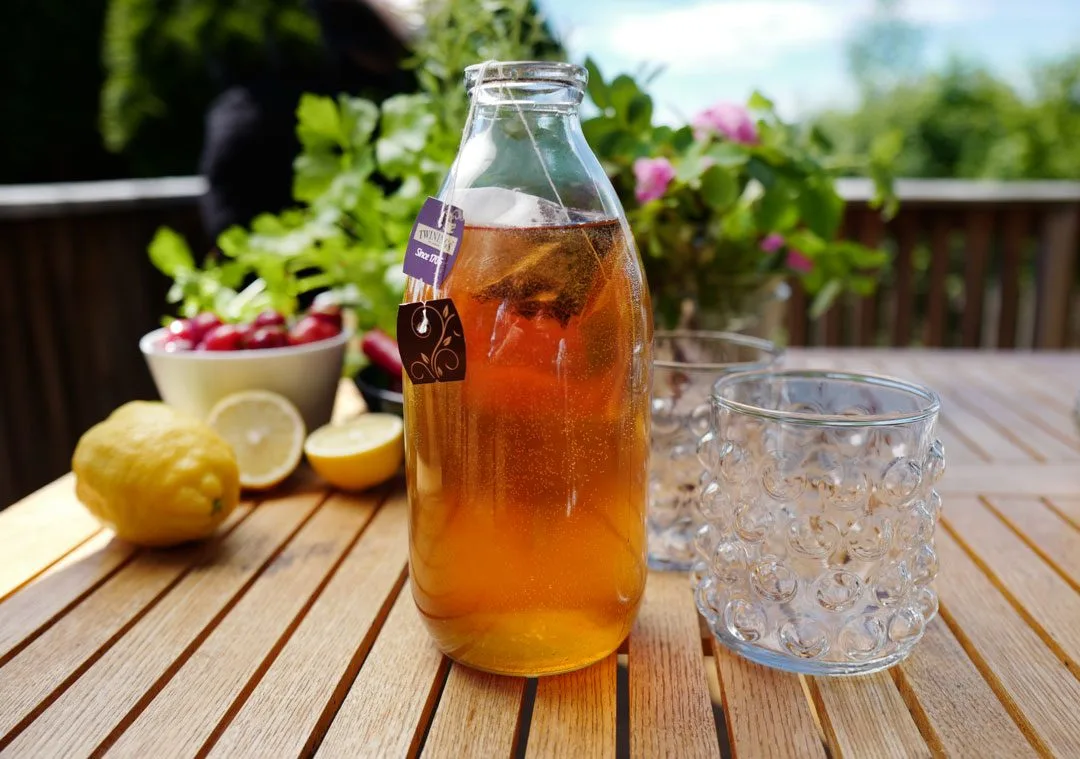 Heng to teposer på kanten av en vannflaske. Fyll opp med vann og la stå i kjøleskapet i fire timer. Fjern teposene. Server med isbiter og tørkede sitrusskiver som du får i pakke på Gallerian Strömstad.