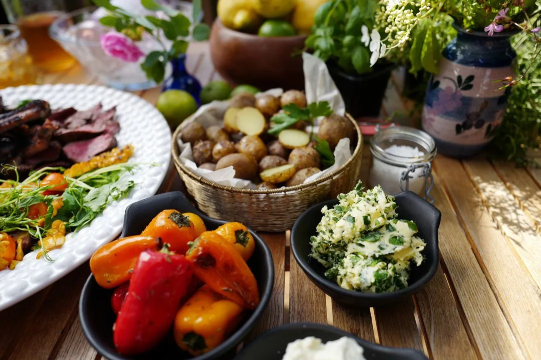 - Poteter: Kok nypoteter med skallet på i saltet vann til de er møre. Del dem i to og server dem varme til grillmaten.