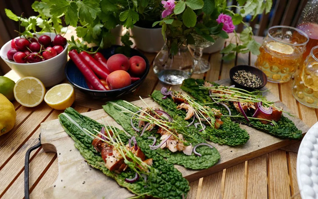 Alle som griller kjenner til den litt «plagsomme» vennen som sirkler rundt grillen som en sulten ulv. – Er maten ferdig snart?. Men en slik i nærheten lønner det seg å ha noe på lur. Jeg har laget to typer «ventepølser». En sunn med svartkålblader (grillet myke), varmrøkt laks fra fiskedisken, soya, løk og furikake (japansk krydderblanding som er perfekt til formålet). Resultatet er en versjon av trendretten Poke fra Hawaii.