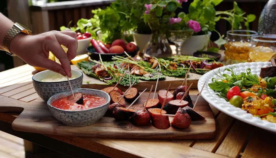Men så har du de som synes dette blir bittelitt for sunt. Ok, skal de få pølser, da? Ja, det skal de. Kjøttfulle kvalitetspølser servert med en hurtig hjemmelaget aprikosketchup og bakt hvitløksmajones. Det er mat som holder dem på avstand for en stund, kan jeg si deg! Nå kan du jobbe videre med grillingen helt uten avbrytelser.