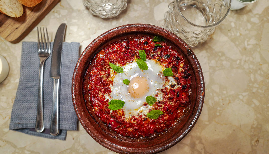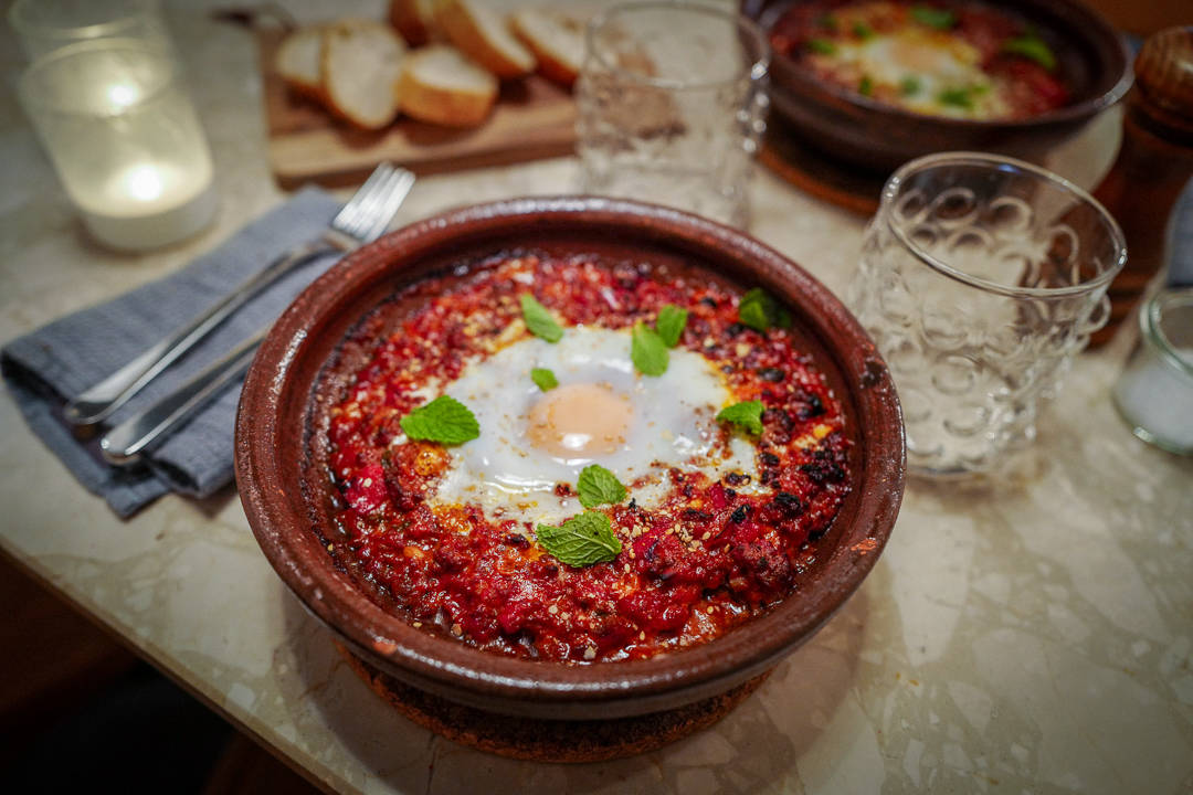- Lag en grop i midten med en skje og knekk egg i. Sett tilbake i ovnen til eggene nesten har satt seg. Pynt med mer hakket mynte og deilig brød. La avkjøle seg litt følr du spiser retten for ellers brenner du tungen.
