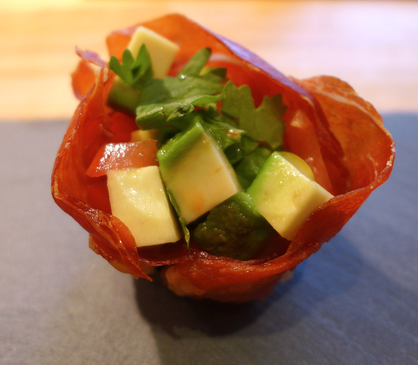 Skjær en avokado i knøttsmå terninger. gjør det sammen med en tomat (uten frøene). Bland og press litt limejuice over. Tilsett en klype flaksalt og litt god olivenolje samt frisk koriander. Bland forsiktig og legg i spekeskinkekurvene.