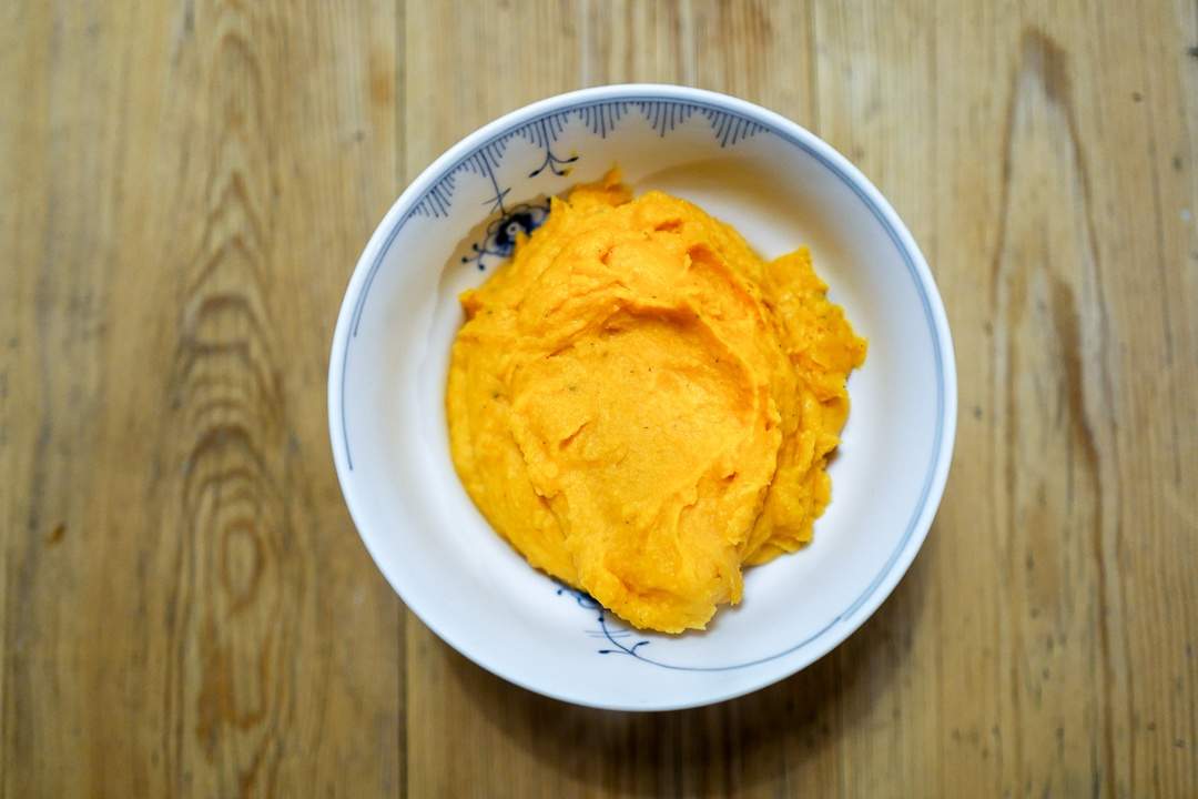 - Når søtpotetene er myke (det merker du når du klemmer på søtpotetene og det kjennes ut som å klemme på en pose med potetmel) tar du dem ut og skreller av skallet. Mos søtpoteten i en blender med smør- og sitrusblandingen. Smak til med mer salt.