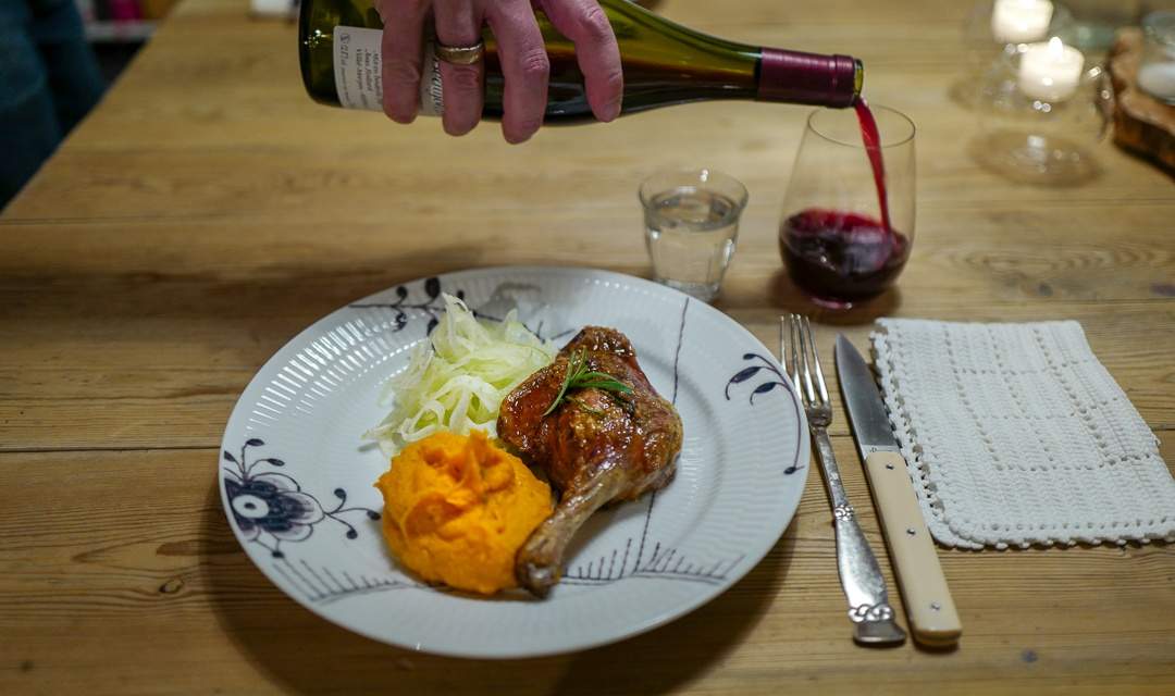 Drikk gjerne viner av druen gamay eller pinot noir til retten.