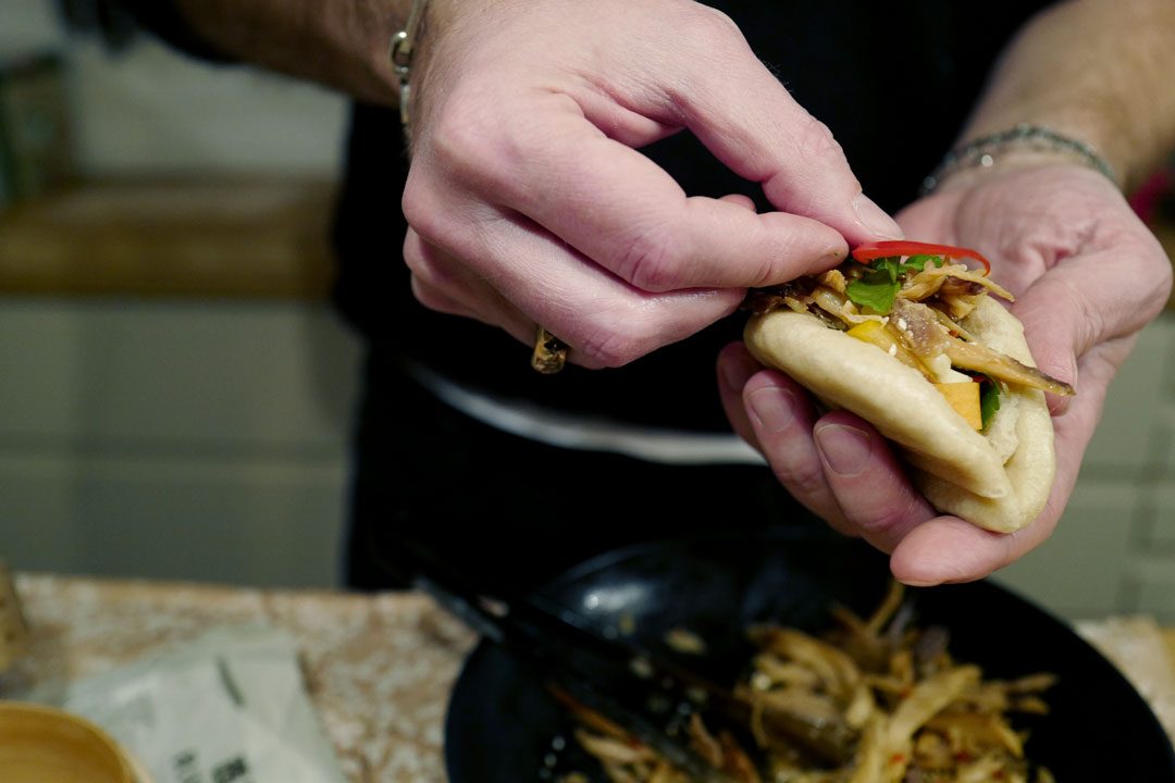 Trill hele deigen til en stor bolle. Del den i 8 kakestykker. Hvert stykke trilles til en kule og kjevles ut til en oval. Brett over på midten og legg den på et bakepapir. Du skal nå ha åtte buns. Legg dem i en bambuskurv med lokk på toppen av en gryte med litt kokende vann. Nå skal de dampe seg ferdig. Etter 15 minutter er de ferdige.