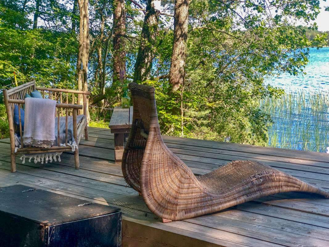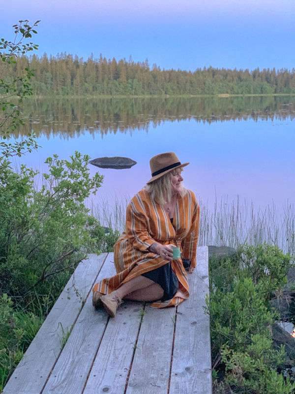 Vi sitter og ser utover Hallasjöen mens badstuen og badestampen varmes opp.
