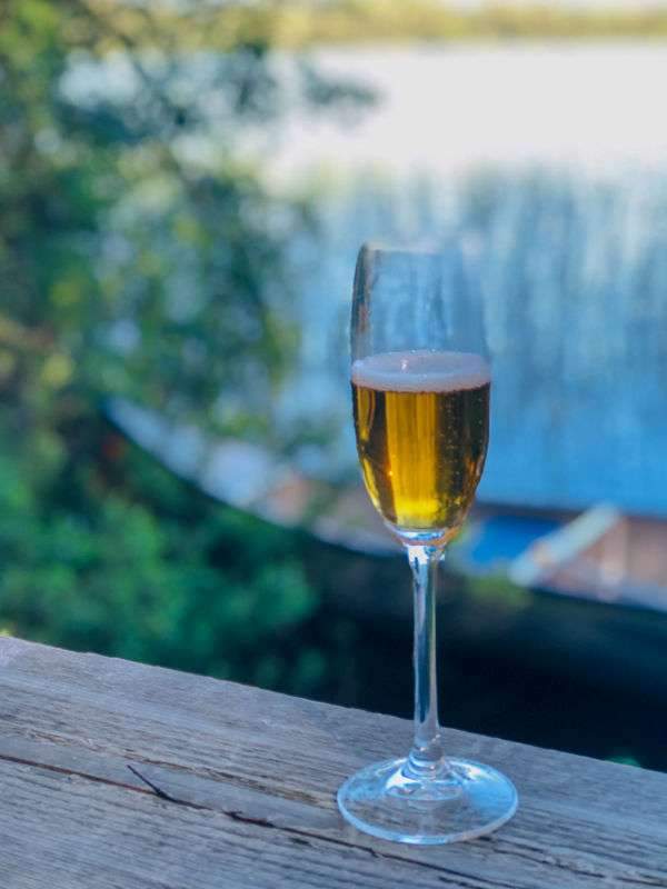 Flemming viser oss rundt på området før vi setter oss i solen og nyter et glass syrefrisk sider. En av kokkene forbereder snacks til oss over bålet. Grillede rugbrødskiver serveres med kremost og tynne skiver av nepe og blomster.