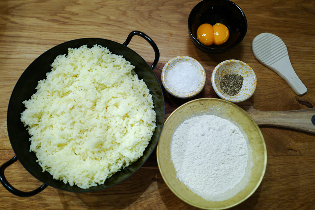 Det aller første du gjør når du skal lage gnocchi er å sette over poteter. Behold skallet på og kok opp i usaltet vann. La potetene bli møre. Avkjøl dem litt før du skreller dem og presser dem fint igjennom en grønnsaksmølle