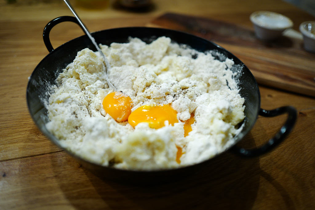 Bland potet med eggeplommer, mel, salt, pepper, parmesan og muskat til du får en fin deig. Bruk en tresleiv. Du må muligens bruke litt mer mel for å samle deigen. Dette kommer ann på størrelsene på eggeplommene og fuktigheten i potetene du bruker.