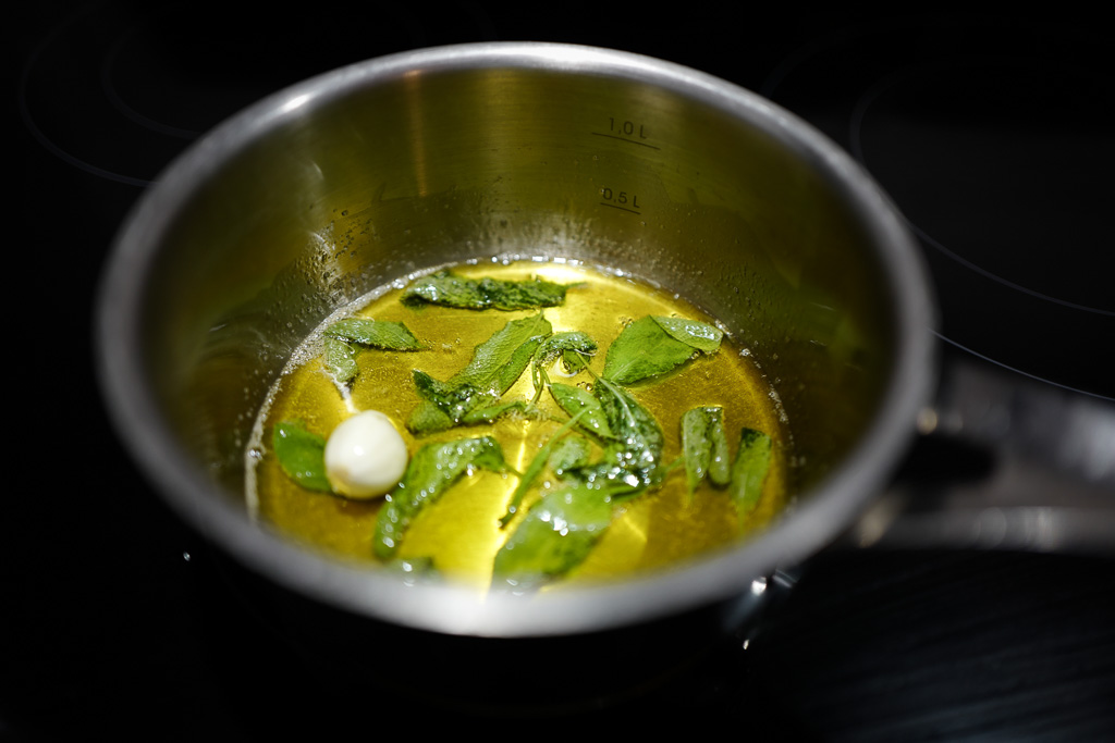 Ha det tilbake i en ren kjele og kok opp. Senk temperaturen til medium og legg i et hvitløksfedd og masse frisk salvie. Smøret tar til seg deilig smak av urter og hvitløk. Før servering fjerner du hvitløksfeddet.