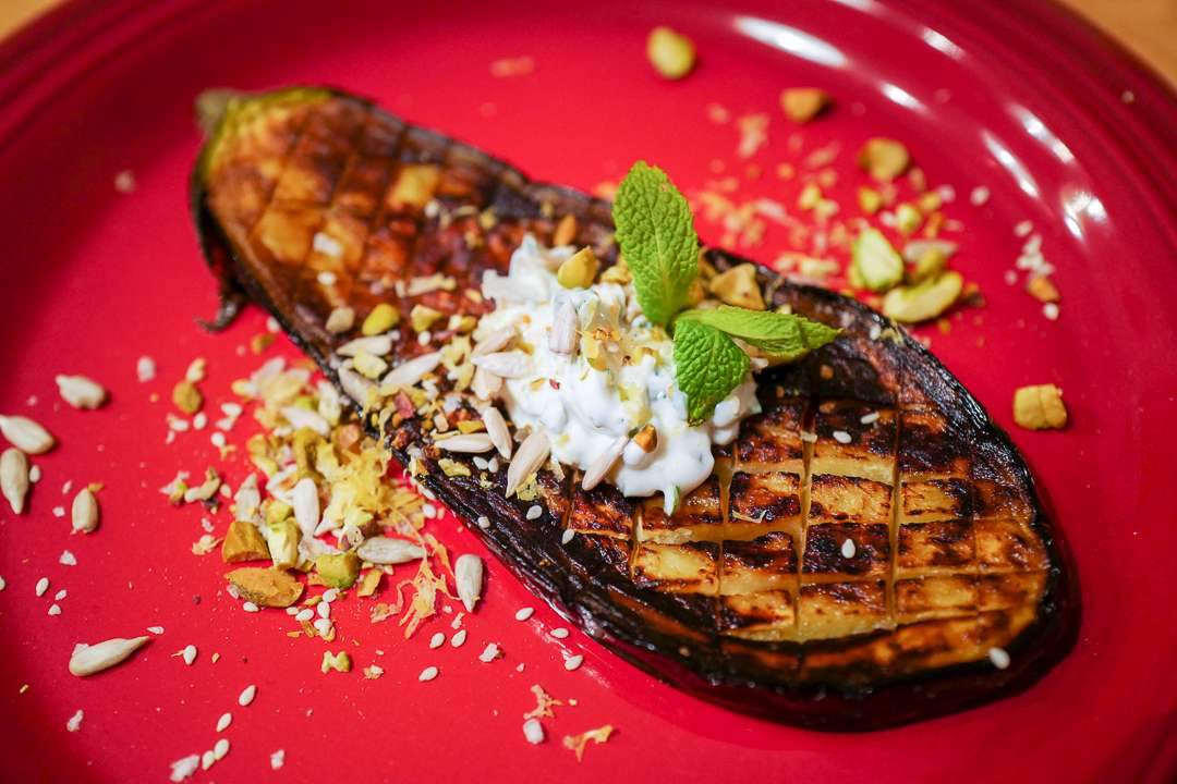 - Server auberginskiver med dukkah og yoghurtdressing.