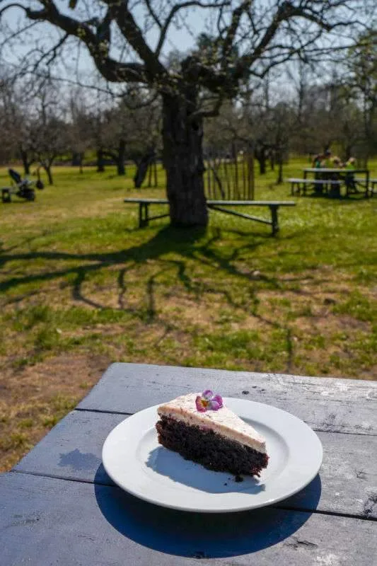 Du kan sitte i hagen blant eldgamle frukttrær og nyte en kopp urtete (urter fra egen hage) og et stykke rødbetekake. Eller gå for den tradisjonelle kanelbollen. En ekte diamant i Stockholm.