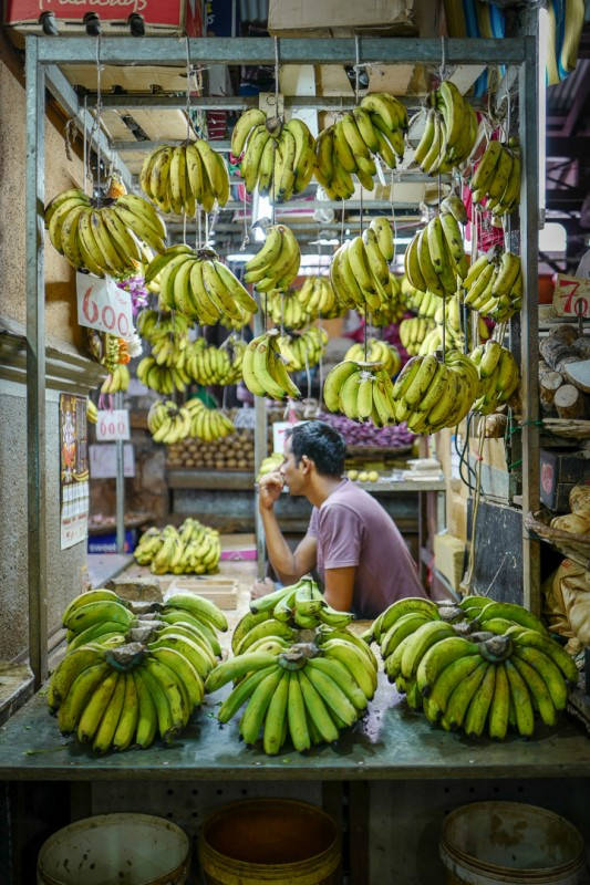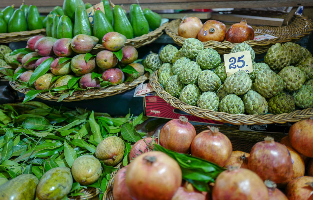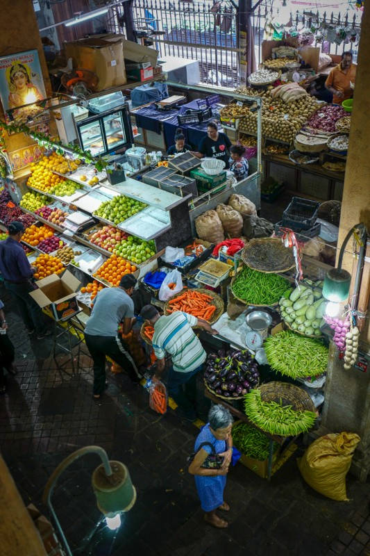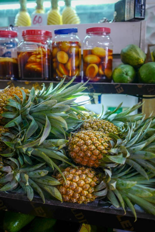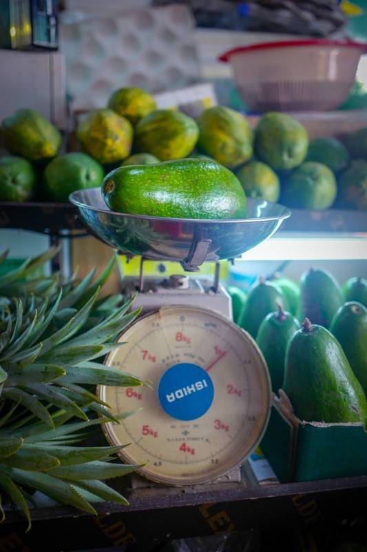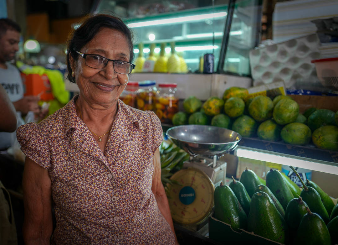 Helt øverst i høyre hjørnet på markedet (når du har fjellene i ryggen) ligger en liten bod der en eldre dame smiler mot oss. Hun spesialiserer seg på frukt og grønnsaker. Avokadoene hun selger veier over 1 kg. Ja, det er korrekt. Over 1 kg! De er lokale. Det samme er agurkene. Hun er også spesialist på mango. Hun forteller at det finnes over 30 forskjellige mangoarter på øya og at ikke mange av dem er i sesong nå. Vi får smake på en variant. Hun heller tamarinsirup over mangobitene og gir dem til oss. De smaker himmelsk. Mulig de ikke er i sesong nå, men disse bitene smaker mer moden enn vi noen gang vil få i butikkene i Norge.