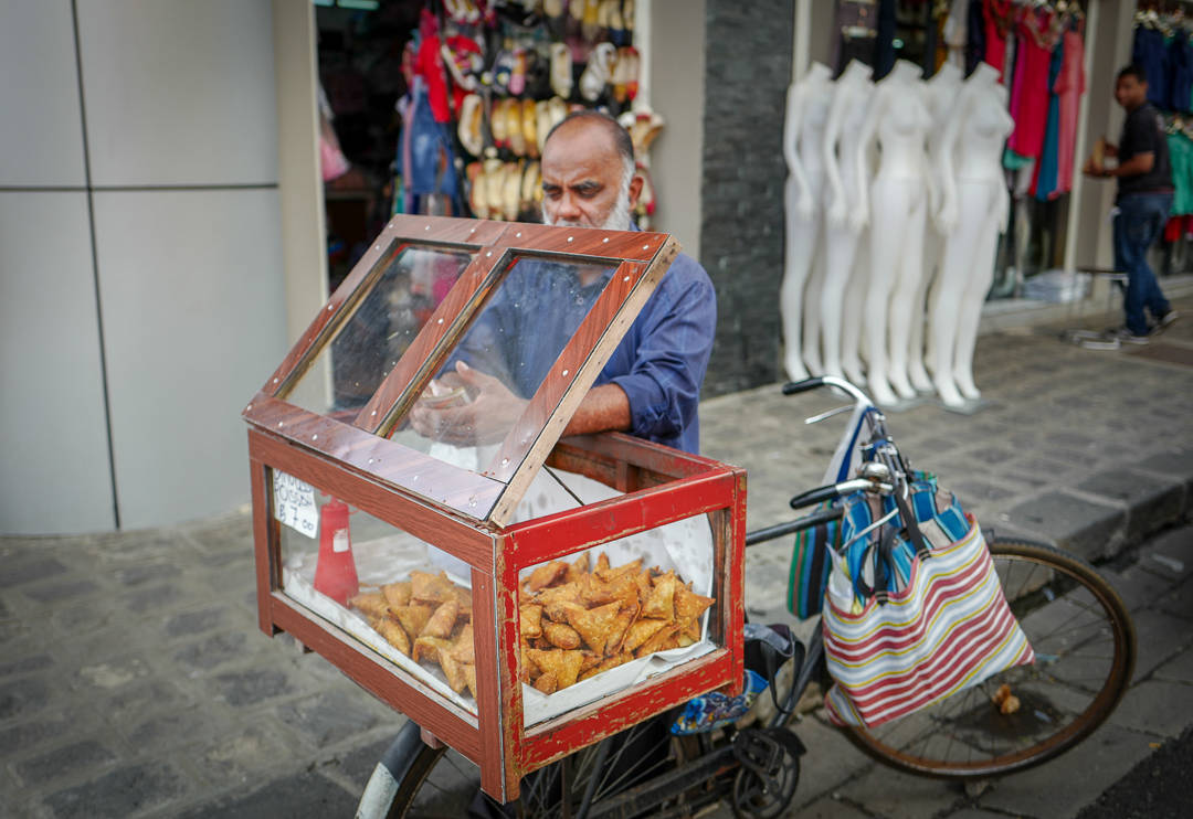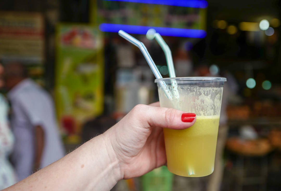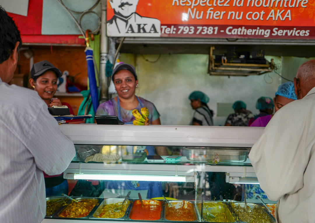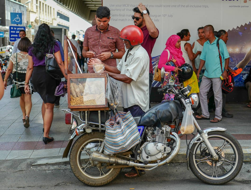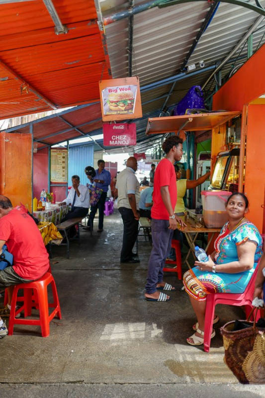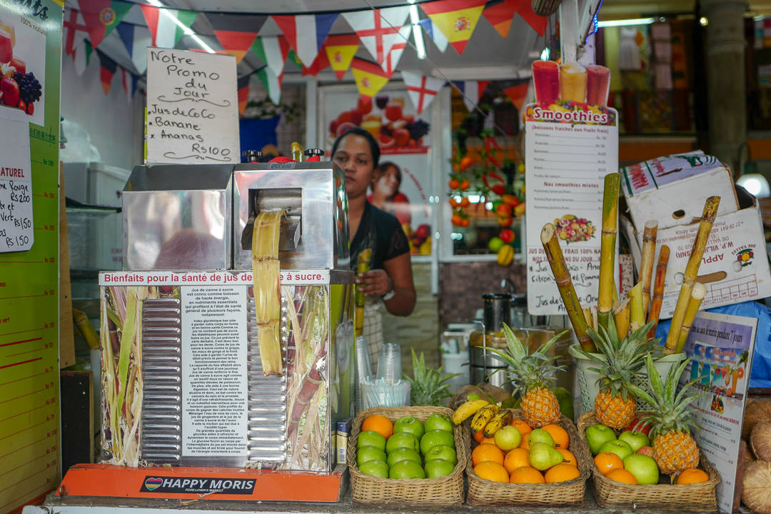 Utenfor markedet finner du boder langs muren. Mange av dem serverer mat og drikke. Vi stopper opp i en juicekiosk der de presser sukkerrør til juice. Sukkerrør finner du over hele Mauritius. Det var Big Business før. Helt til EU gjorde om på sukker-importreglene. Dette har gjort at sukkerindustrien på øya har kollapset helt. Mye går selvsagt til romproduksjon, men mange har mistet jobbene sine og bedrifter er lagt ned. Vi skal uansett nyte nypresset sukkerrørjuice. Det smaker helt fantastisk og jeg har tidligere kun drukket ren sukkerrørjuice. Denne juicen består av sukkerrørjuice, limesaft og juice fra grønne epler. Det gjør drikken til en mye friskere og lettdrikkende sak. Den er fantastisk avkjølende og leskende. Og det trenger vi i 30 grader og ekstrem luftfuktighet.