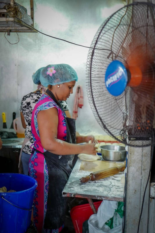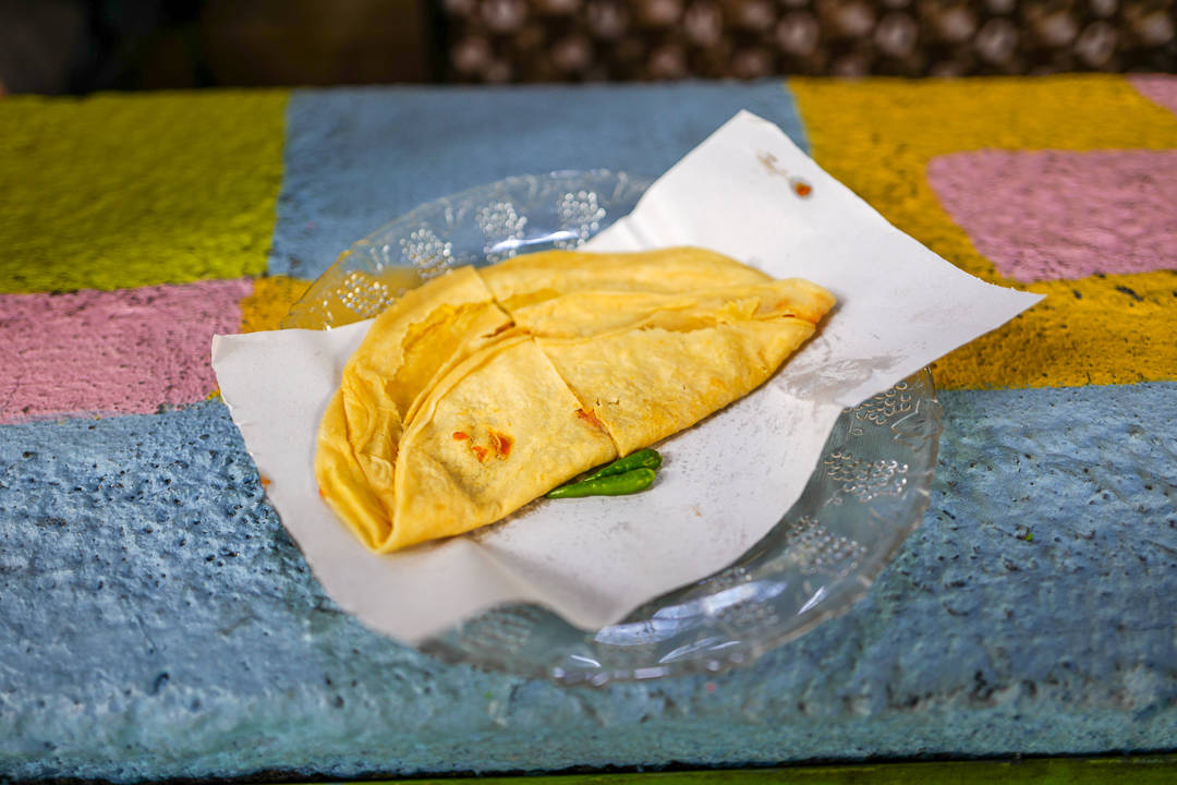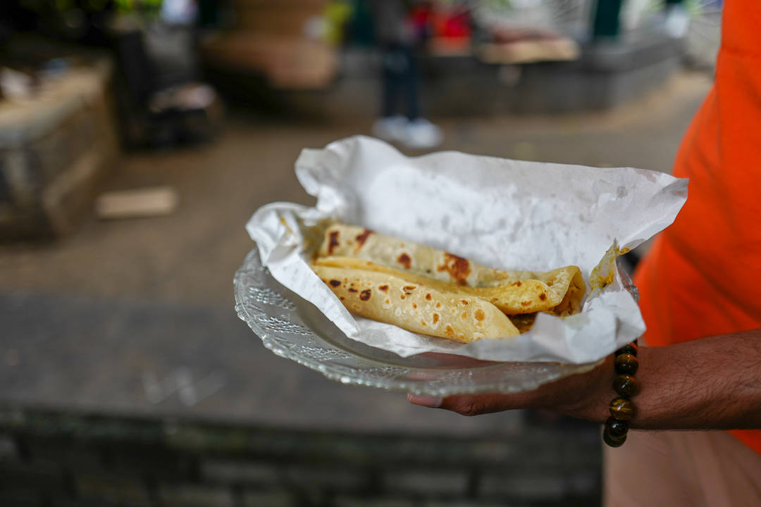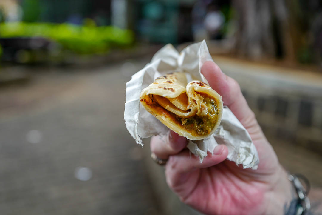 Roti Aka er første stopp på matrunden. Adrian bestiller farata – en tykkere variant av roti. Dette er en nybakt lefse som fylles med godsaker. Du kan få dem med fisk, kylling, oksekjøtt eller grønnsaker.