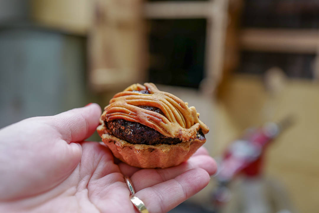 De selger ikke til butikker. Alt må kjøpes fra det lille lokalet i sentrum av Port Louis. Vi smaker på en fantastisk terte fylt med banan og brunsukker. Den er ikke alt for søt. Det er tydelig at terten er inspirert av britens styre av øya og tekulturen. Kakene viser fransk konditorkunst. Det er den perfekte tekaken. Terteskallet er tynt og sprøtt. Fyllet er generøst og det smaker karamellisert og moden banan. Dette er terten for meg!
