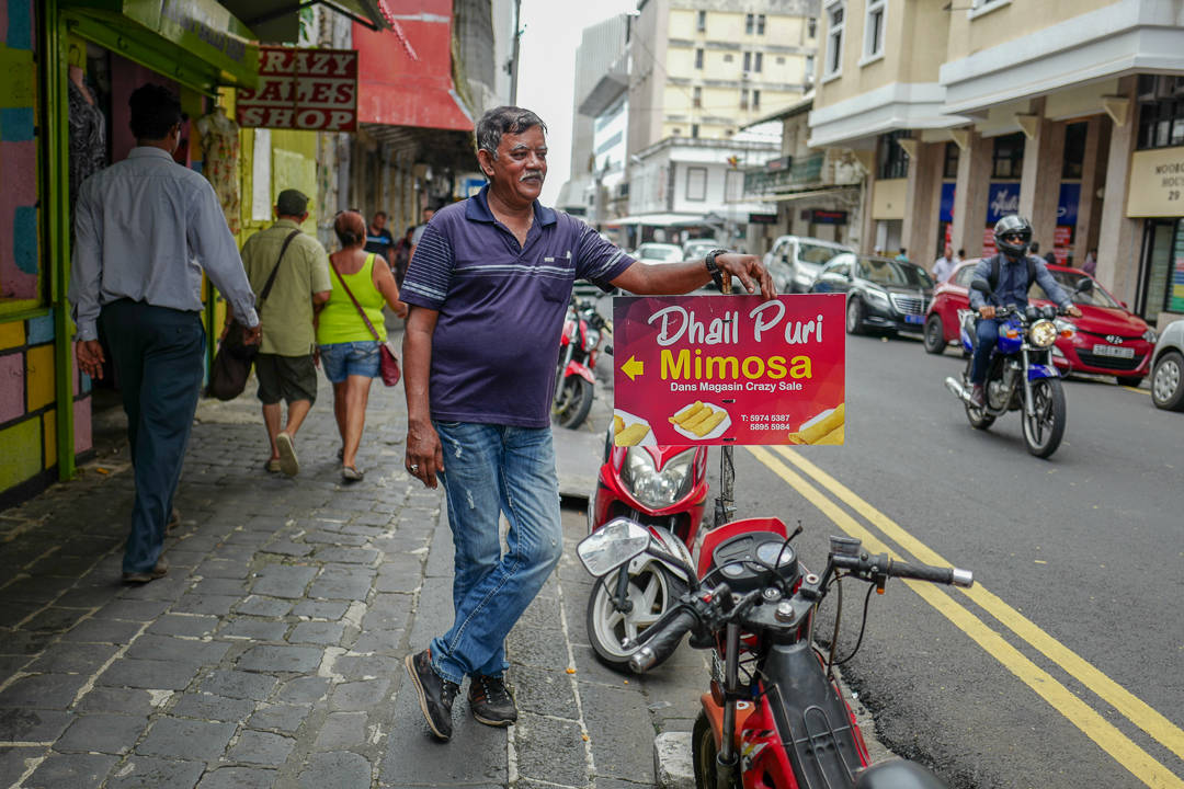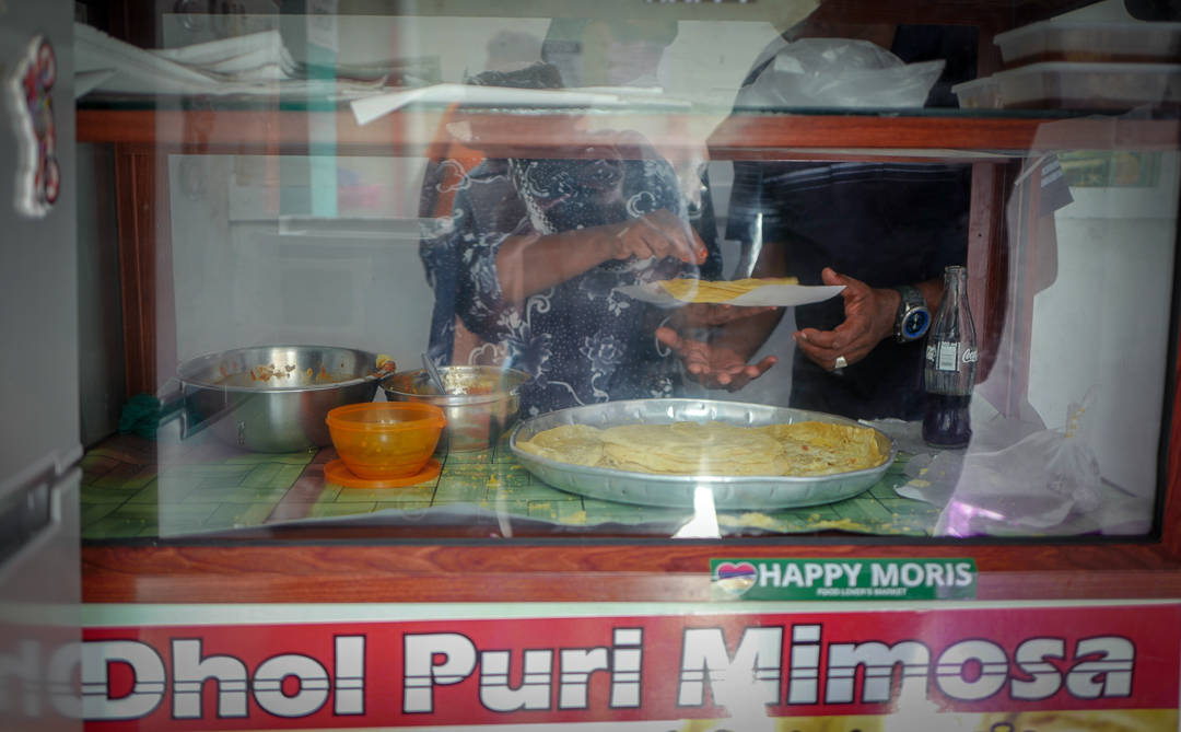 Klemt midt inne mellom to klesbutikker (ja, inne i en trang gang) ligger Mimosa Dhol Puri. De har laget Dhol Puri i førti år. Dhol Puri er noe av det aller beste jeg vet. Jeg spiser alltid det når jeg er på Mauritius. Det er tynne pannekakelignende lefser som fylles med kremete linser og chilisaus. De brettes sammen og spises, akkurat som med farata og roti.