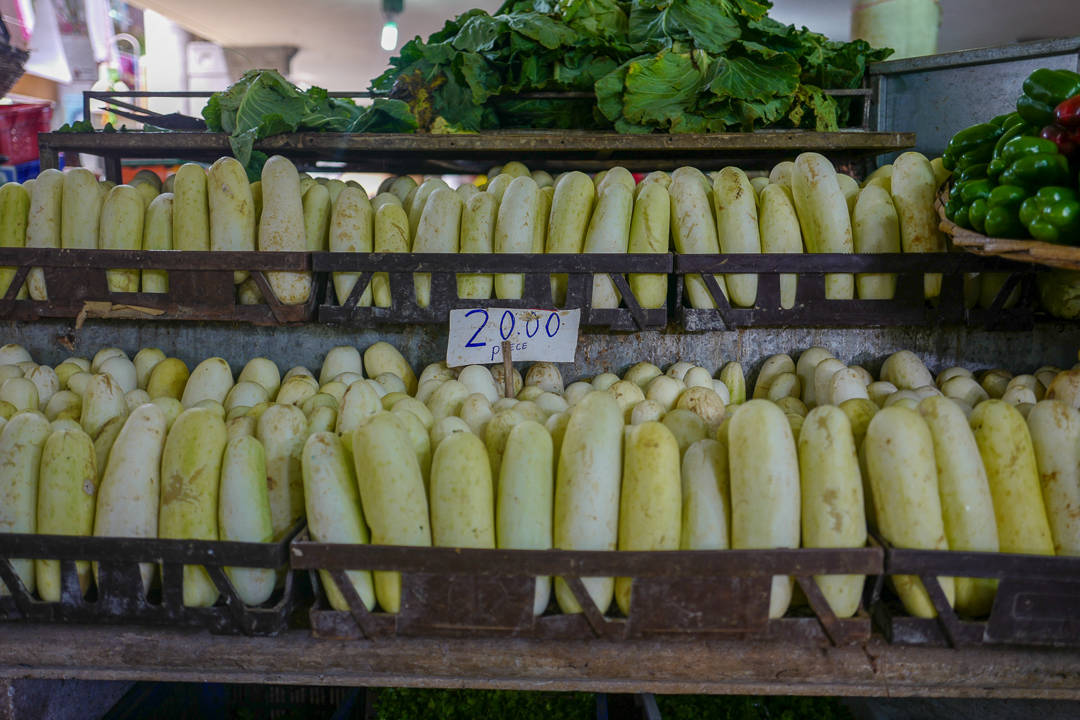Urter, frukt og grønnsaker. I sidelokalet serveres mat. I deler som ligger på nedsiden av grønnsaksmarkedet selges kjøtt.