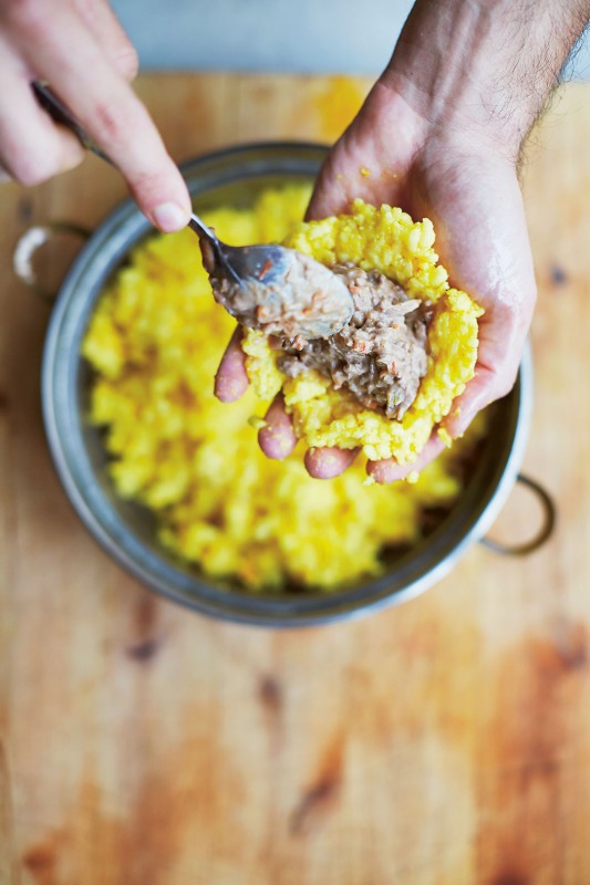 Bruk hendene dine til å arbeide med risen for å bryte ned kornene; skvis og klem godt i cirka fem minutter. (Dette er faktisk ganske terapeutisk og morsomt!) Hvis du dypper hendene dine i kaldt vann først, vil risen klebe seg mindre.