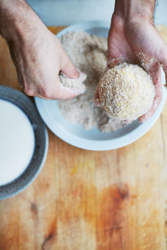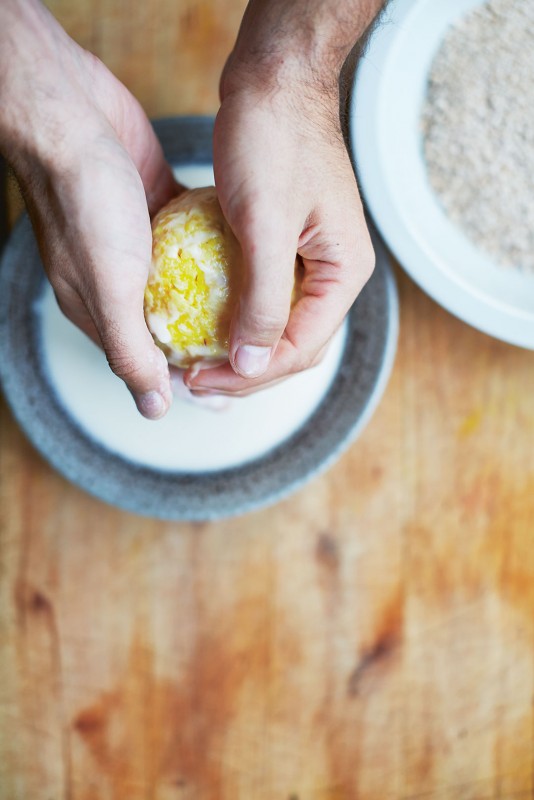 Vei opp cirka 120 g av risen og trykk den litt flat med hendene dine. Lag en liten grop i midten. Putt cirka 30 g av enten kjøttstuingen eller ost-og-skinke-blandingen i gropen. Lukk risen om fyllet slik at det blir en ball. Dypp ballen ned i røren og la den deretter dryppe av før du ruller den i brødkrummen. Plukk opp litt mer brødkrumme som du presser lett ned i overflaten. Nå er de klare til å frityrstekes. Fram til dette trinnet kan du gjerne ha laget dem på forhånd og oppbevart dem i fryseboksen. I så fall bør de få tine i kjøleskapet natten over før du frityrsteker dem.