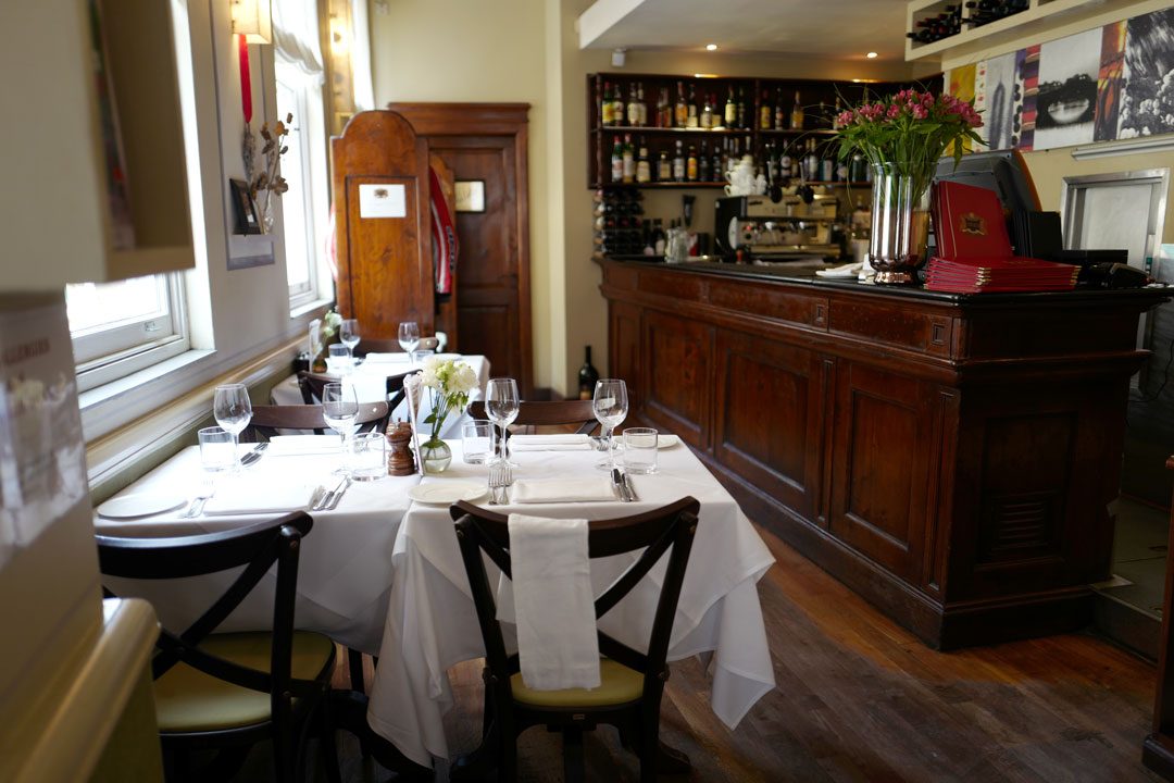 Vi sitter i den trivelige restauranten deres i poshe Marylebone Lane.