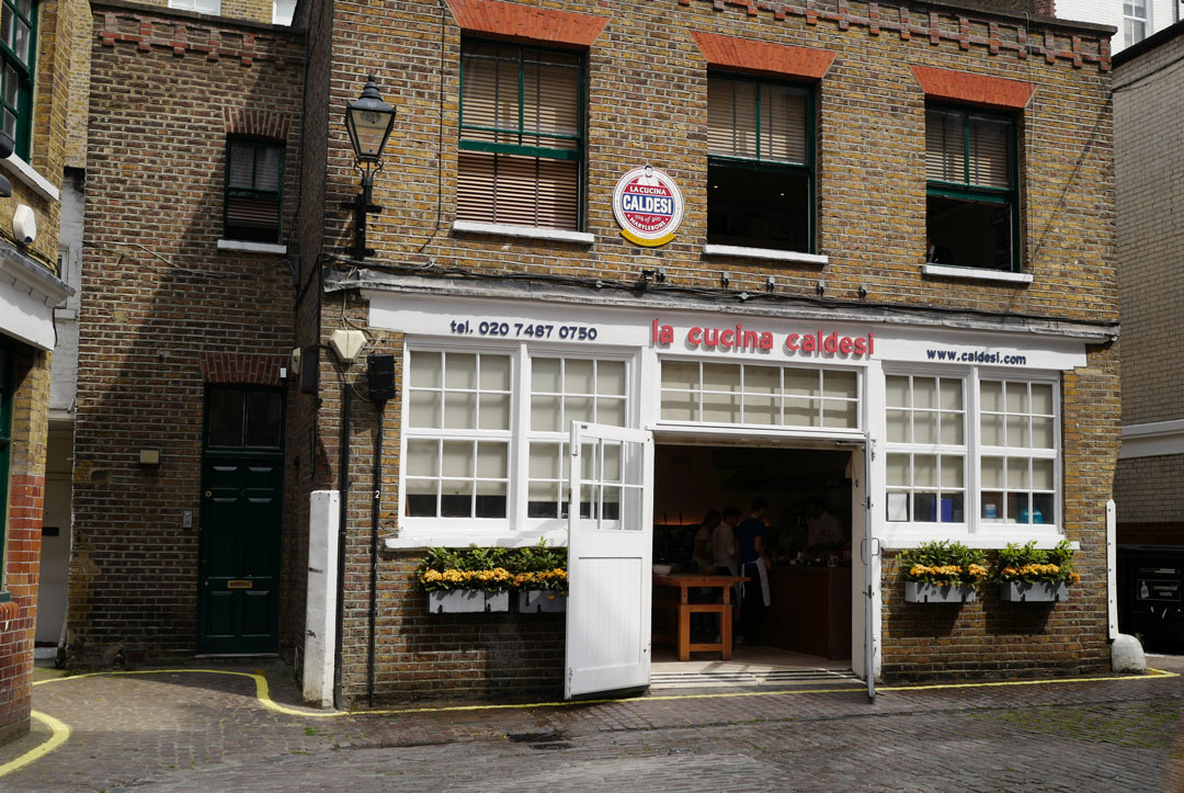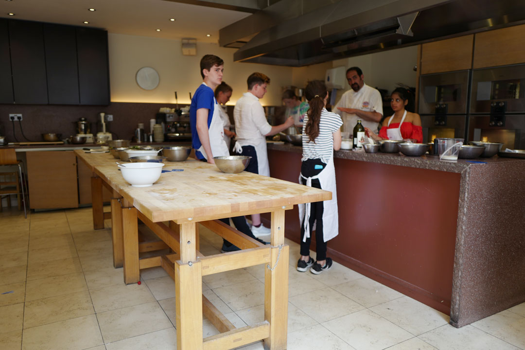 I gaten bak restauranten Caffé Caldesi i London har Katie og Giancarlo egen matskole. Det er kokken Stefano som er på jobb når vi er innom. Her kan skoleklasser og privatpersoner lære å lage italiensk mat. De har daglige matkurs. Book et matkurs neste gang du er i London.
