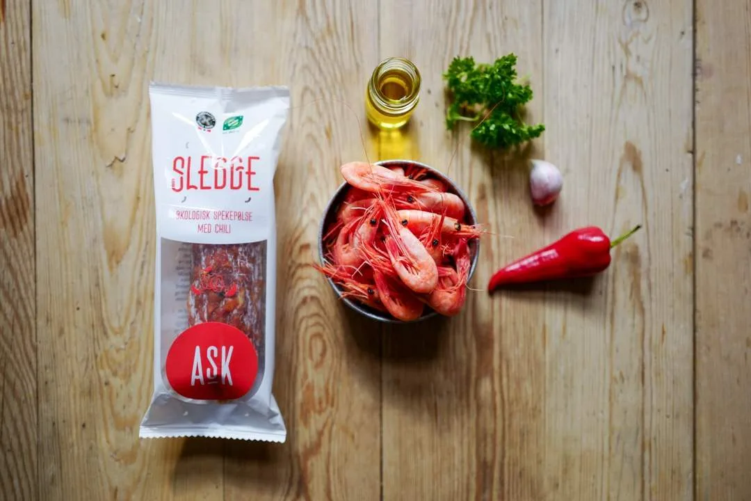 Første rett ut i dag er en fyrrig rekerett med «Slegge», chili, hvitløk og reker. Dette er en variant av den spanske tapasretten «Gambas al Ajillo». Når man bruker norske, kokte og saltede reker må man være forsiktig. Rekene blir til gummi hvis man varmebehandler dem. Men jeg har et triks. Når du lager en enkel kraft på rekeskallene får du en magisk kraft som gir en autentisk smak til retten.