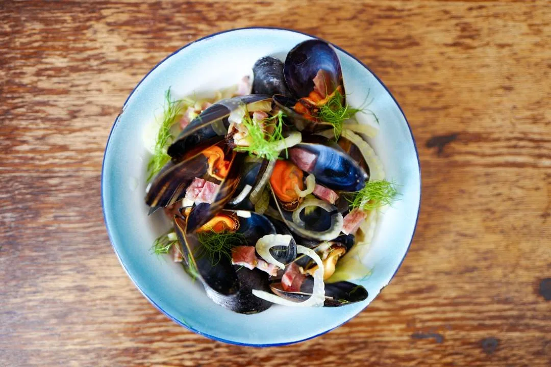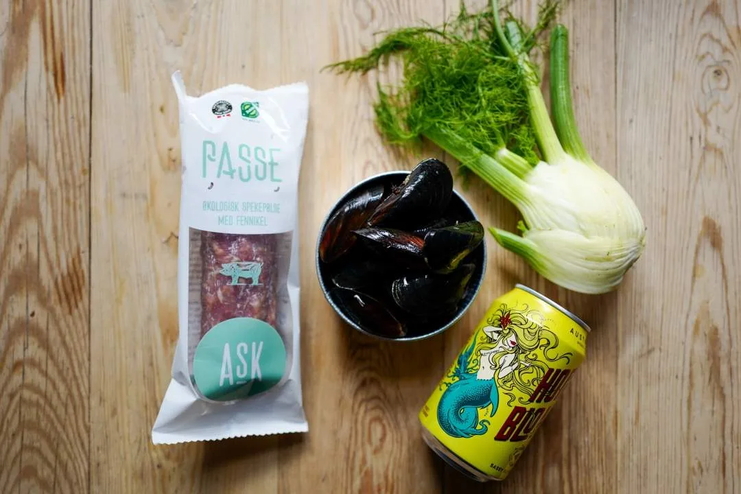 Blåskjell dampet i øl med fennikel og «Passe» (fennikelsalami)