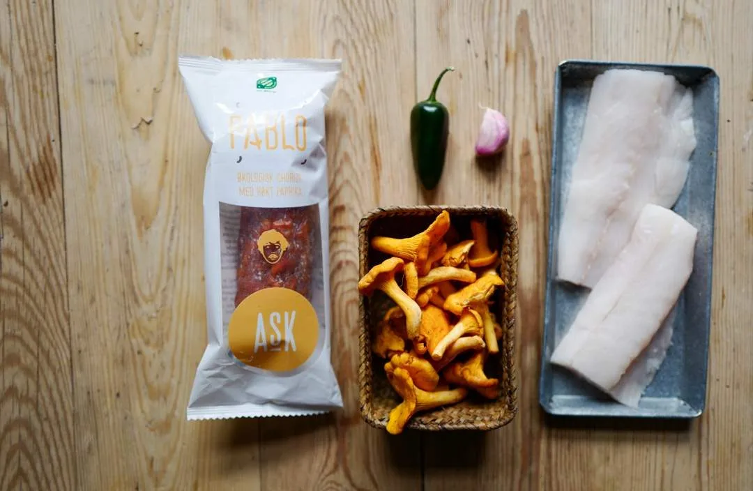 Isgalt (torsk eller annen hvit fisk) med kantareller og chorizo