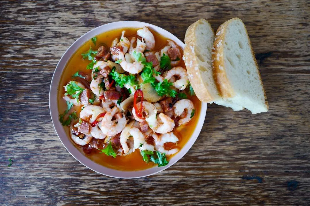 Varm en tørr panne og tilsett resten av oljen. Tilsett hvitløk og chili og la dette stå under oppsyn til hvitløken blir litt gyllen, men ikke brent. Ha rekekraften i pannen og kok opp. Trekk pannen av platen og tilsett reker og persille. Server med en gang med brød på siden.