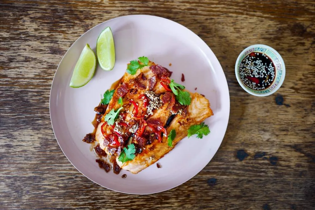 Sett en panne på platen og varm den. Ha i oljen og så fisken. Stek et minutt på sterk varme og snu fisken forsiktig og stek i et minutt. Hell over søt soya og sesamfrø samt hvitløk og chili. Legg fisken på et fat og hell soyakaramellen over. Dryss salami-chips eller -smuler over fisken. Server med lime og koriander.