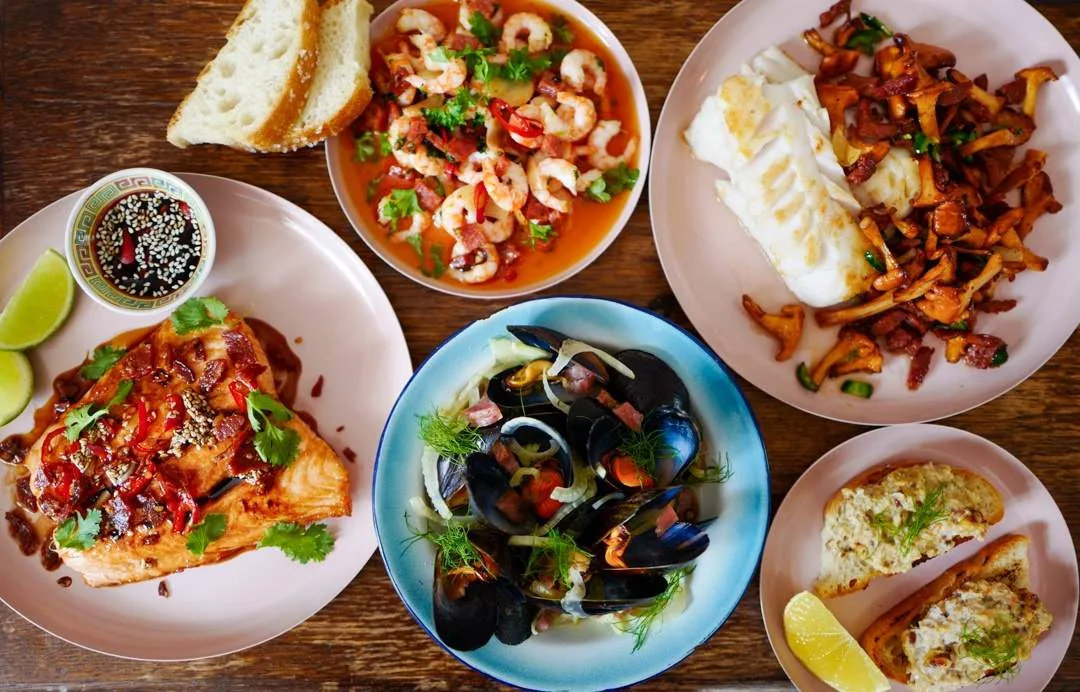 Jeg har tatt for meg fisk som isgalt (men her kan torsk og annen hvit fisk brukes) for den har en deilig og (faktisk) delikat smak av skalldyr. Jeg har også brukt et stykke laks (velg økologisk eller villaks hvis mulig). Av skalldyr har jeg valgt ferske reker, deilige fylte krabbeskjell og økologiske blåskjell. Skal si det ble fem herlige retter på bordet.