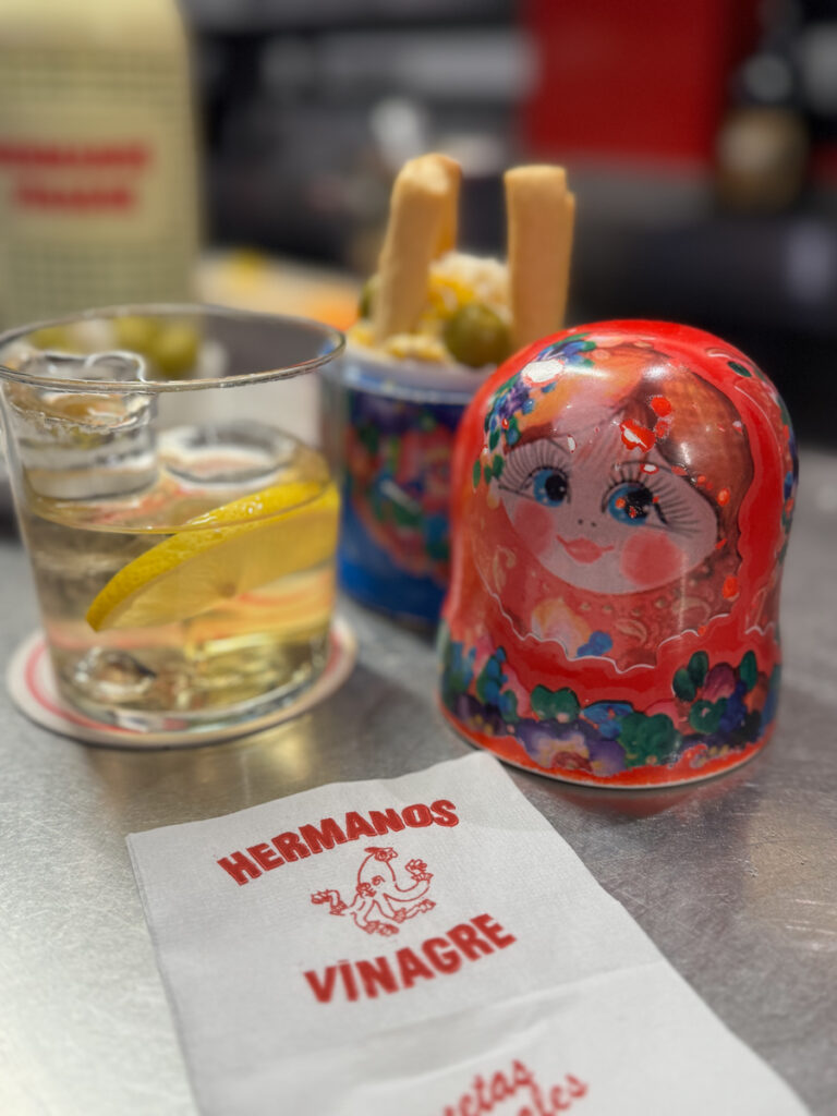 Kult interiør og morsomme retter. Sørg for å bestille Ensaladilla Rusa (“russisk salat eller en slags italiensk salat som vi kjenner den som med potet, majones, tunfisk, gulrøtter…) som kommer i en russisk Matrjosjka.