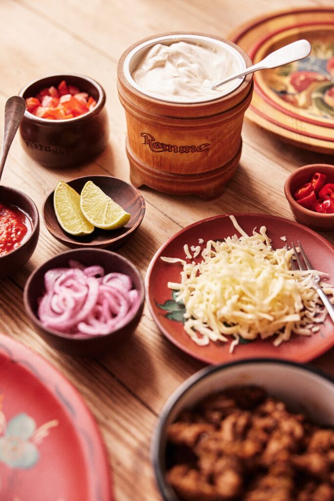 • Ost og rømme går det mye av, så beregn ca 6 bokser rømme og 1,5-2 kg revet ost (til 40 personer).