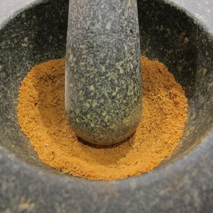 Rist spisskummenfrø og karvefrø i en tørr, men varm panne til du kjenner at det dufter godt. Så smæsjer du krydderne i en morter. Bland sammen de andre krydderne.