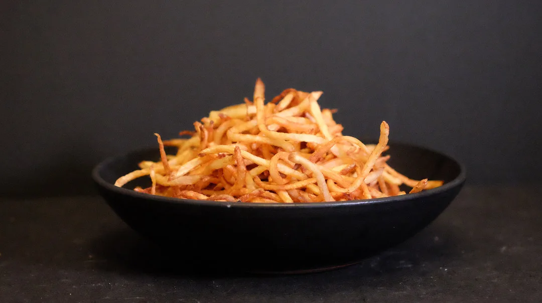 - Det du må gjøre er å legge potetstavene i kaldt vann i en halvtimes tid før du skal fritere dem for å få ut litt av stivelsen.