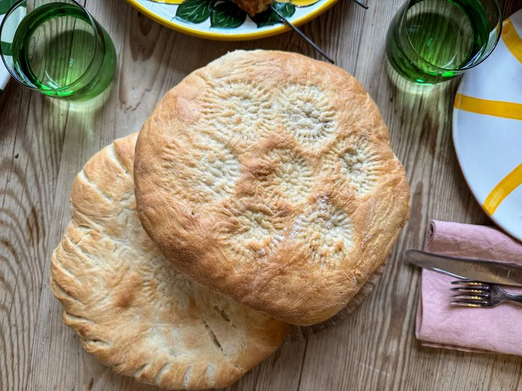 En pizzadeig trenger ikke ende opp som en pizza. Du kan steke deigen, utrullet som en pizza, men med spennende topping. Server skiver av brødet …