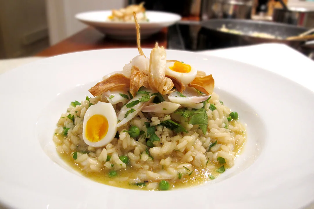 Risotto med røkt kolje, erter, vaktelegg og pastinakkchips