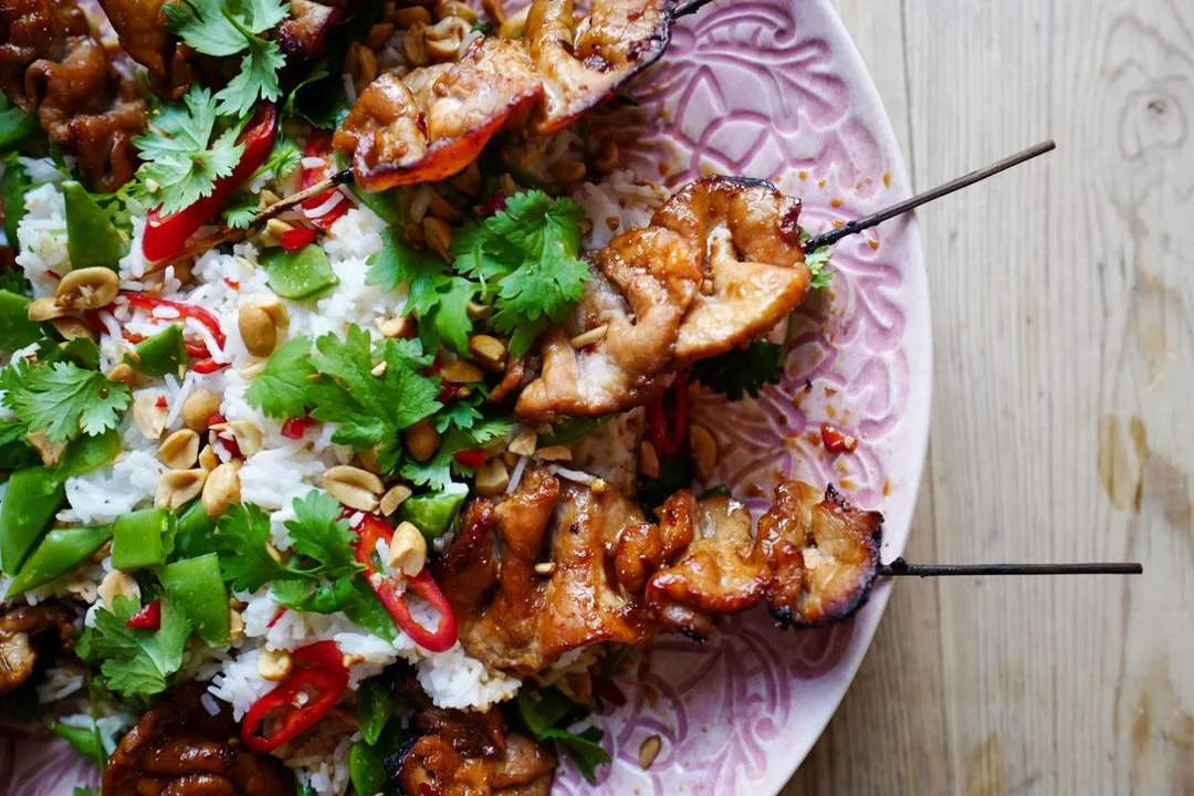 Grillspyd av svin med ananaschutney og kokosris
