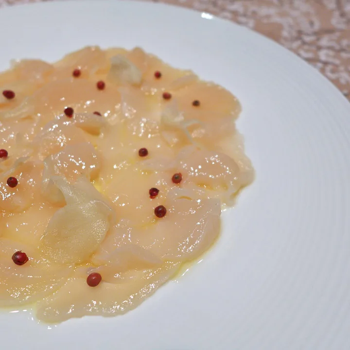 Carpaccio av kamskjell med appelsin, syltet ingefær og rosépepper