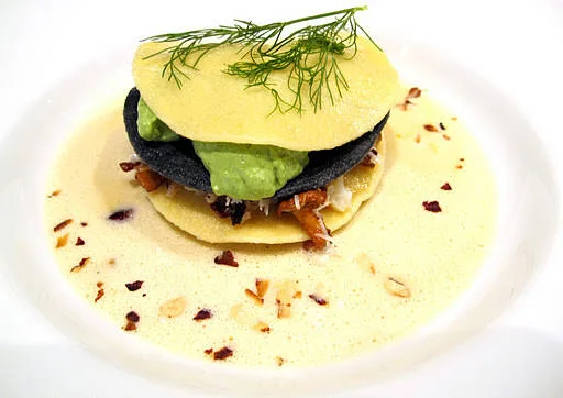 Forrett: Krabbe med spinat- og ricottakrem, fennikelmarinerte tomater, smørstekte kantareller, ristede hasselnøtter med pasta black and white i en skummende skalldyrsaus. Skalldyrkraft: krabbeskall fra 20 …