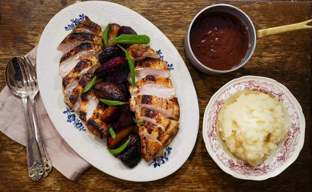 Kyllingbryst med plommer, rødbeter og selleripuré