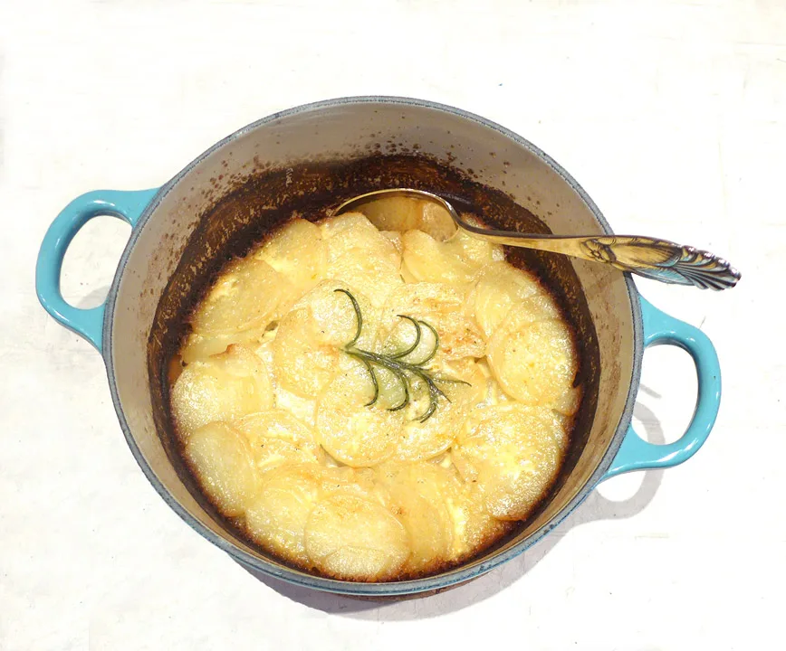 Disse potetskivene har jeg lagt i jerngryte tilsatt parfymert fløte. Grunnen til at jeg kaller det parfymert fløte er at jeg har kokt opp fløten …