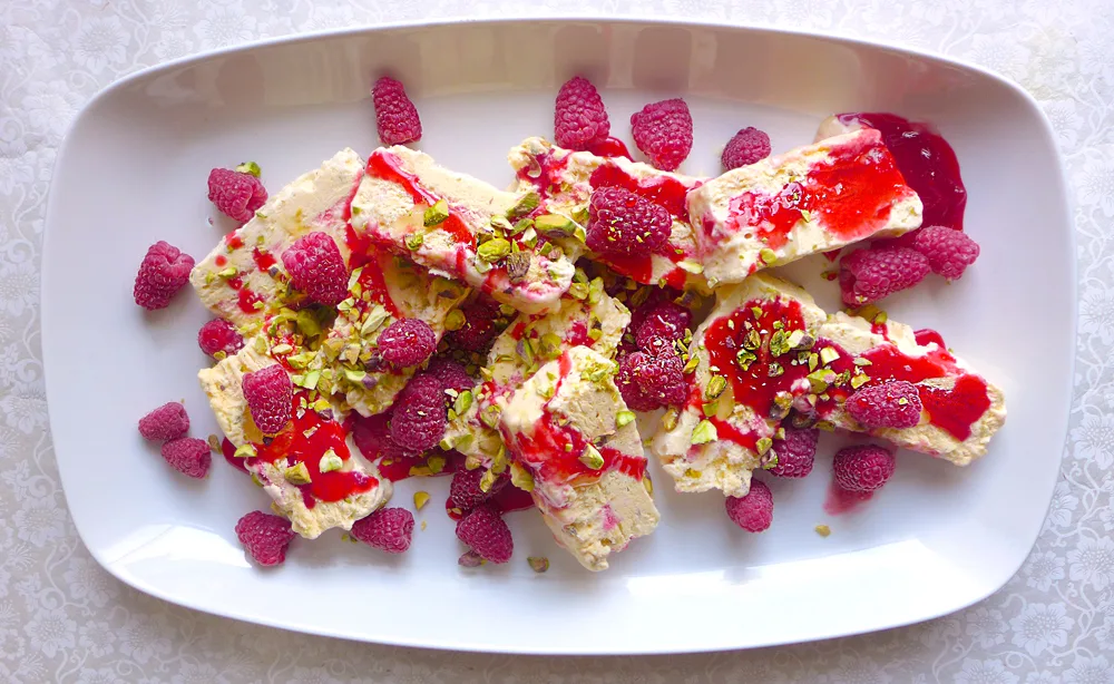 Sommerparfait med bringebær, pistasjnøtter, honning og rosevann